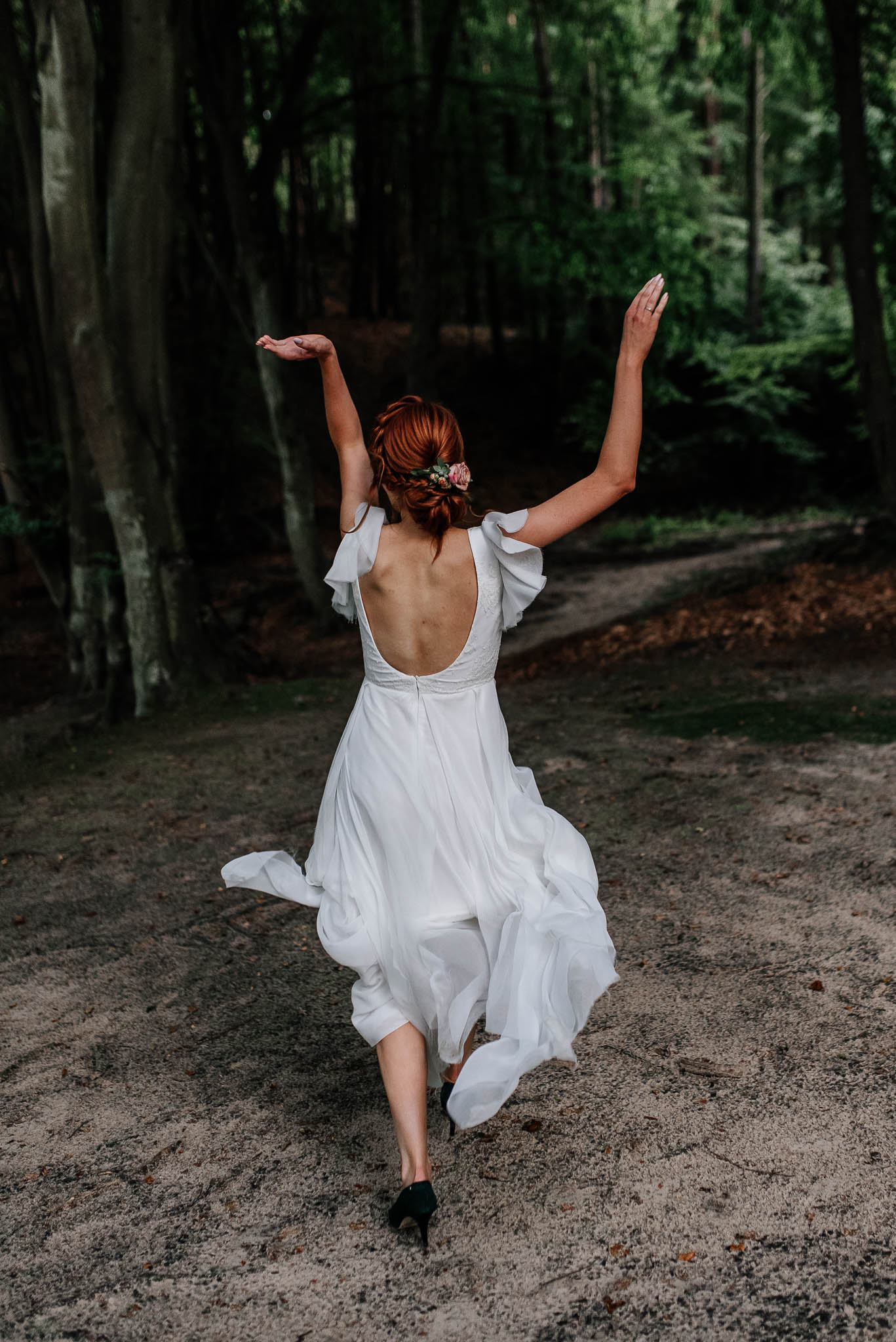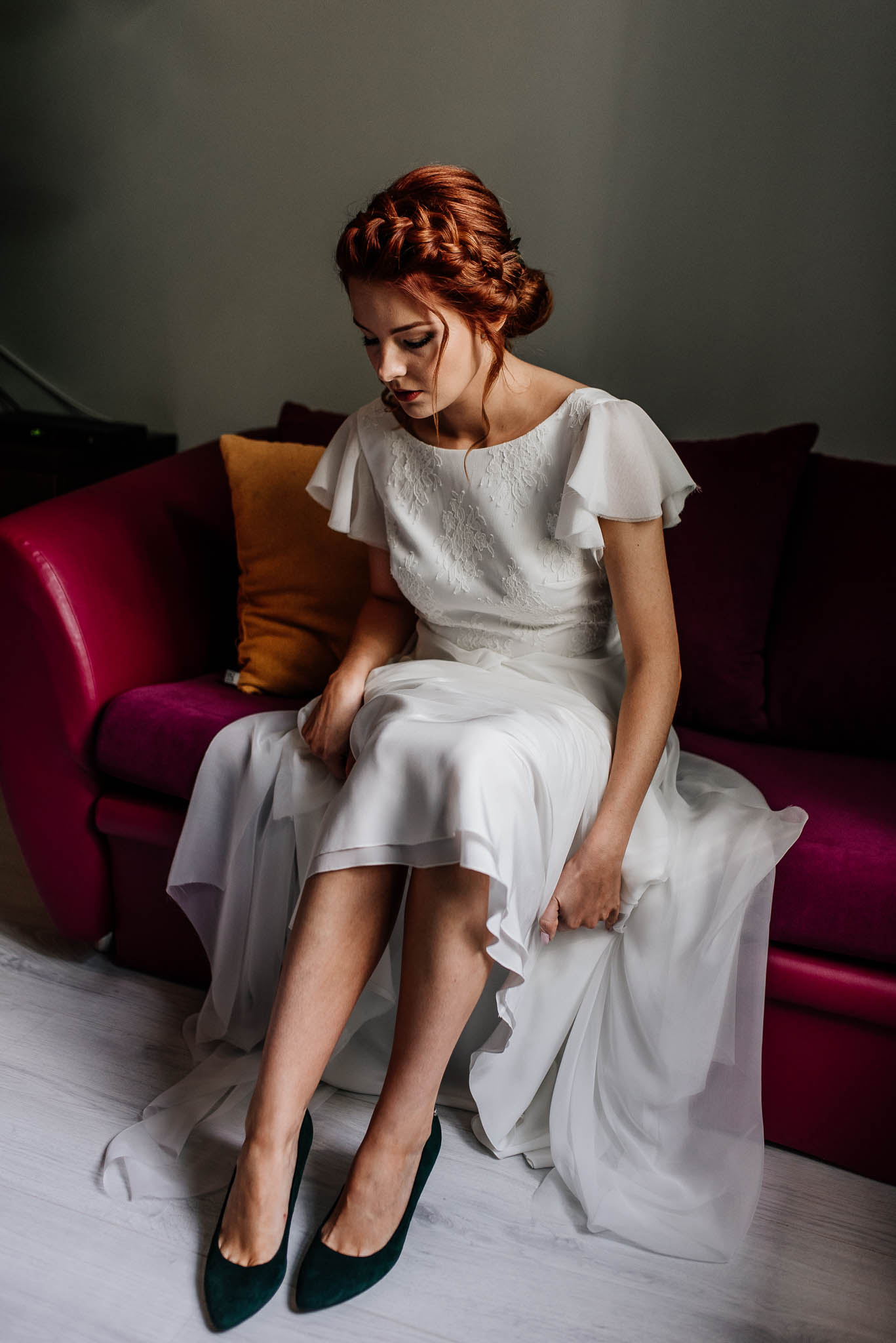 Buty: Czółenka z Venezii w kolorze butelkowej zieleni – sprawdzone jeszcze na wcześniejszym weselu. Nie przepadam za szpilkami, ale w tych przetańczyłam całą noc, i cały czas były tak samo wygodne. Uznałam, że przyniosą mi szczęście 😉 poza tym bardzo chciałam, aby buty wyraźnie odróżniały się kolorystycznie od sukni.